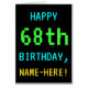 This simple, fun birthday greeting card design features a message like "HAPPY 68th BIRTHDAY, NAME-HERE!". It also features a fun, pixelated look reminiscent of the appearance of classic 8-bit era computer games of the 1980s and early 1990s. The name on the front and the message on the inside can be customised. It could be sent or given to somebody who is celebrating their sixty eighth birthday, and who enjoys playing older computer games. [~Z0000099]