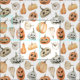 This design features a charming watercolor pattern of pumpkins and jack-o'-lanterns in a soft, muted colour palette. The design includes various pumpkin shapes and sizes, painted in gentle shades of orange, cream, and grey. Each jack-o'-lantern has a unique carved face, ranging from happy and friendly to slightly spooky, adding character and variety to the pattern. The pumpkins are arranged on a clean, white background, allowing the delicate watercolor textures to stand out. The overall design is both festive and adorable, perfect for capturing the whimsical spirit of Halloween in a cosy, artistic way.