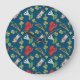 A patriotic Round Wall Clock, with a row of Welsh Emblems, a girl in welsh traditional dress, a red dragon, a bunch of leeks, a harp and a bunch of daffodils. This pattern can be adjusted to fit any Wall Clock and you can change the deep blue background.