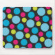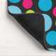A whimsical mouse pad with turquoise blue, pink, and lime green dots of various sizes on a black background. A fun and modern pattern.