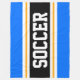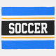 This sporty, athletic design features bold SOCCER text inside a highlighted wide black stripe with double white and yellow racing stripes against bright blue outer stripes. The text can be personalised.
