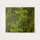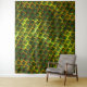 Estampado com imagens quadradas verde colocadas como se fossem tijolos em uma parede - inclinada -, onde as linhas amarelas ou douradas na volta das pequenas imagens podem parecer em alto relevo ou o fundo composto que imagem verde parece estar mais profundo que as linhas amarelo dourado que pode parecer um tipo de grade.
