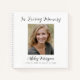 Personalise "In Loving Memory" funeral sign-in notebook with Black Script Name, Dates and Photo on white background. Extra text on back or delete.