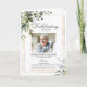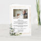 Funeral memorial program featuring on the front a photo of the deceased, their name, dates, the memorial venue, date of the event, and elegant gold frame with watercolor greenery. On the inside is an obituary, and order of service; and on the back another photo, a thank you note and the second venue for after the funeral. For further customisation, please click the "customise further" link and use our design tool to modify this template. If you need help or matching items, please contact me.