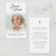 Funeral Photo Forever Hearts Cross Prayer Card. Keep the memory of a loved one close with this custom personalised prayer card featuring one treasured photo, the title FOREVER IN OUR HEARTS accented with two hearts, name and dates and an editable prayer or your remembrance message accented with a simple cross. With its simple yet elegant classic black and white design and calligraphy script typography, it makes a meaningful keepsake to share at a funeral, memorial service or Celebration of Life and offers comfort and a lasting tribute for family and friends. Its small and portable size of 3.5x2" (wallet-sized) makes it convenient for loved ones to carry it with them as a reminder of your loved one’s life and spirit.