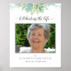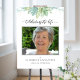 My condolences on your loss. Honour your loved one with a thoughtful delicate Funeral Photo Welcome Sign with exquisite hand painted watercolor greenery design on top and the phrase "Celebrating the Life of" in modern graceful Calligraphy. Variety of sizes to choose from. Greenery foliage and watercolor stains in pale turquoise, blue and green hues. Coordinating Funeral/Celebration of Life invite, guestbook, thank you notes and program available. Part of our "Delicate Funeral, Memorial" collection.