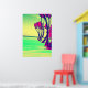 psychedelic colour effect applied on photograph of palm trees on beach.