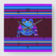 Funky Colourful Frog on a background of blue and purple stripes. These are unique and funny gifts.