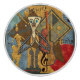 For the Jazz and Funky Musical Art Lovers in your home, office, dorm or club! A truly unique coaster featuring Leslie Sigal Javorek's original Surrealist digital painting comprising wild, fun, bizarre musicians, instruments, and notation in bold rich colours alternating w/grungy black on ivory striped 6 in chequerboard fashion.