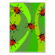 Funky cartoon red ladybugs scuttling around against a retro green swirly background design.