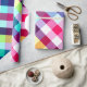A roll of wrapping paper featuring a colourful plaid pattern design in rainbow colours.