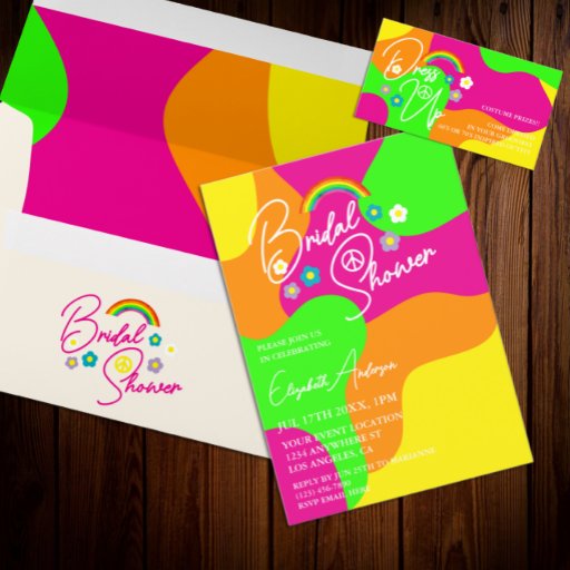 Bold and colourful retro bridal shower with flowers, rainbow, and peace sign