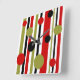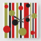 Funky retro stripes and dots clock has olive green, black , red and white stripes and dots for a fun vintage look.