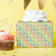 Coral, light blue, slate grey, and apple green bubbly squares with dots inside decorate this sunny yellow wrapping paper in a diagonal pattern, creating a fun and playful gift wrap perfect for any occasion.