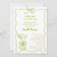 Introducing the "Tini One on the Way" Funky & Whimsical Hand-Drawn Dirty Martini Baby Shower Invitation with QR Code in green and white – A trendy and playful invite to celebrate the mum-to-be! Featuring a squiggly frame with a charming coquette bow, this design is accented with a hand-drawn dirty martini with two olives in the bottom corner. The clean white background lets the combination of handwritten script and funky block fonts shine, creating a fun yet elegant vibe. Perfect for setting the tone of an unforgettable baby shower with friends and family. Make it easy for friends and family to view your baby registry by updating the QR Code in the back of the invite. Easily customise this template with your event details. Also available as an instant digital download for easy sharing via email, text, or social media.