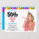 A funny, lighthearted, 50th birthday photo invitation you can personalise and send out for your fiftieth birthday party celebration. The words "50th Birthday Blast" are set using popular typography. You can replace the sample photo with one of your own. The text colours can be changed using the edit menu. A birthday pattern shows on the back of the card. Other colours and patterns are available.