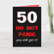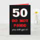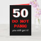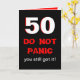 This funny 50th birthday card features a large 50 in white which is edged in red on a black background. Below the 50 are the words "DO NOT PANIC" written in a panic looking type style. Then the words "you still got it" appear. Inside is a funny take off from the front to make a funny milestone 50th birthday card. Copyright Kathy Henis