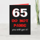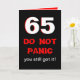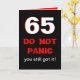 This funny milestone 65th birthday card is for men. A big 65 gets your attention with the words "DO NOT PANIC" right below in red. Then the words "you still got it." Of course, the funny is inside. This is a great birthday card for the man with a sense of humour celebrating a 65th birthday. Copyright Kathy Henis