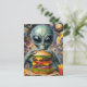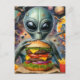An alien eating a cheeseburger a fun and colourful unique AI generated design
