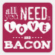 The design reads 'All YOu Need Is Love and Bacon' in a variety of fun beautiful fonts, making a funny humourous design for anyone who loves bacon.