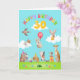 A cute and funny multicolor 30th birthday card. On a blue sky background, the typography text reads Happy Birthday 30, with the 30 sat on a cloud. The scene below shows multiple animals including an owl, duck, cat, frog, mouse and dogs gathered for the Birthday celebration with balloons, gifts and cake. The apprehensive birthday bunny rabbit is seen clutching on to and floating away with a 29 years old balloon.