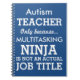 This funny notebook says Autism Teacher, only because Multitasking Ninja isn't an actual job title. This notebook can be personalised to say Special Needs Teacher, Down Syndrome Teacher, or even just a general Special Teacher. The background is Blue however you can change it by clicking on Customise It. Let me know if you need assistance with changing the background colour. Because of the white font it's best if you use dark colours. These notebooks are great for making light of how challenging it is to be a special needs teacher, instructor, TA teaching assistant or IA instructional assistant. As a mum of an autistic boy I know we need to have a good chuckle and keep a sense of humour. These notebooks make an inexpensive, practical gift to show your support or an occasion such as Teacher Appreciation.