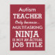 This funny postcard says Autism Teacher, only because Multitasking Ninja isn't an actual job title. This postcard can be personalised to say Special Needs Teacher, Down Syndrome Teacher, or even just a general Special Teacher. The background is Red however you can change it by clicking on Customise It. Let me know if you need assistance with changing the background colour. Because of the white font it's best if you use dark colours. These postcards are great for making light of how challenging it is to be a special needs teacher, instructor, TA teaching assistant or IA instructional assistant. As a mum of an autistic boy I know we need to have a good chuckle and keep a sense of humour. These cards make an inexpensive gift to show your support on an occasion such as Teacher Appreciation.