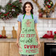 This funny "I just wanna bake and watch Christmas movies" apron features a gingerbread man and Christmas cookies and text in red and green on a light green background with snowflakes. Great gift for the girl who loves to bake and to watch romantic Christmas movies!