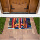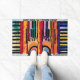 A colourful, cartoon-style doormat with a barcode pattern. Two bare feet are shown standing on the mat, as if being scanned before entering.