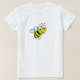 Women's basic, white t-shirt with bee on the back and funny quote: BUZZ BUZZ BUZZ! (Yes, I speak Bee) on the front.