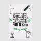 Custom personalised golf towel with a funny saying 'Weekend Forecast Golf with a Chance of Beer' in black and white typography. Within the saying are black and white illustrations of a teed up golf ball and a full beer mug. Surrounding that there's black and white images of a teed up golf ball, a golfer finishing his swing, a flag and a golf bag in the four corners of the towel. In green typography are your first and last initials along with you name on the bottom. Add your first initial on the left, your last initial on the right and your own name on the bottom.