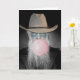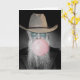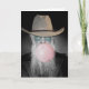 Humourous belated birthday greeting card. Funny photograph of an old guy wearing a cowboy hat, wire rimmed tinted shades, and blowing a big pink bubble. Art, image, and verse copyright © Shoaff Ballanger Studios, 2022.