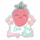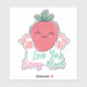 A funny cartoon strawberry with the cutest smile, a red face and green leaves on top with pink love hearts above. Below the berry in pastel pink and green text are the words I Love you Berry Much. Ideal for those who love berries and puns.