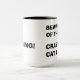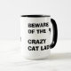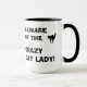 A humourous mug poking a little fun at cat lovers. This black and white themed ringer mug features a frightened cat and the text 'beware of the crazy cat lady' on the right hand side. The left features the word 'warning!'.