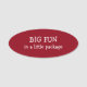 Funny office name tags with humourous phrase Big Fun in a little package with white lettering on a bold and fun red badge colour.