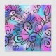 A funny little bird in the upper left corner and floral elements on a pink, purple and turquoise background.