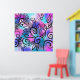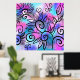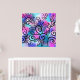 A funny little bird in the upper left corner and floral elements on a pink, purple and turquoise background.