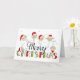 This is a fun Christmas card design featuring six comical little bird characters each wearing a Santa hat. Underneath these cute characters is the hand crafted text 'Merry CHRISTMAS'. Five of the birds are standing/balancing on the word 'Merry', one is asleep on the word 'CHRISTMAS'.