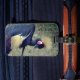 This luggage tag features a black crowned crane with his neck twisted in a funny position.