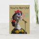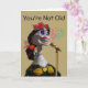 Funny birthday greeting card with a paper mache female skeleton figure at a microphone singing. She is adorned with red roses, a marigold ribbon and bow, and gold accented dress. You’re not old. You’re fine, like a classic tune. Art, image, and verse copyright © Shoaff Ballanger Studios, 2022.