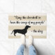 Funny dachshund doormat with the phrase "Ring the doorbell to hear the song of my people" in black script. The background is a taupe and beige stripes pattern.