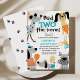 Cute and funny cartoon like dog themed 2nd birthday invitation featuring various dogs, some balloons, party hats and a bone illustrations. The back features a black and white paw pattern.