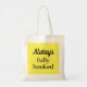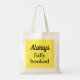One of two of our budget friendly book tote bags. Fun phrase, "Always fully booked" is set up in a template so you can easily personalise it to your own words if you choose. Whatever words you type in will automatically appear on both front and back. Pretty yellow background on 100% machine washable cotton. We also have this design set up as saying "Forever fully booked". With an easy click, this book carrying bag design can be transferred to other sizes and shapes of tote bags.