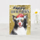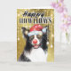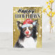 A funny and cute watercolor illustration of a black and white border collie wearing a red Santa hat lined with faux white fur wearing wire rimmed shades and a red reindeer nose. He is tangled up in Xmas tree lights and is framed by long vertical string lights and a faux sparkling gold glitter background. Ideal for business year end wishes to customers or as an adorable holiday card to friends and family.