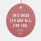 Show your boss some humour with this Funny Boss Firing Quote Personalised Christmas Ceramic Ornament.. It is designed on both sides with a funny saying, "this boss can and will fire you" in bold white lettering on dusty rose background followed by name in trendy hand lettered script and custom year. Perfect boss gift idea for any occasion.