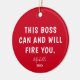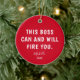 Show your boss some humour with this Funny Boss Red Personalised Year Christmas Ceramic Ornament. It is designed on both sides with a funny saying, "this boss can and will fire you" in bold white lettering on dark red background followed by name in trendy hand lettered script and custom year. Perfect boss gift idea for any occasion.