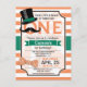 Funny retro moustache, vintage top hat, and bow tie boy's first, 1st, birthday party invite on orange and white stripes pattern. Features green, orange, and white colours. Personalised for your child's, kid's, toddler's, infant's, baby's name. First birthday invitation for boy.