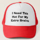 A hat with "I need this hat for my extra brains" on it.