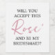 "Will you accept this rose and be my bridesmaid?" Add a special touch to your bridal proposal and enhance it with this funny and unique wine label. It's the perfect way to ask your best friend to stand by your side on your special day!