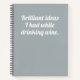After a glass of wine, it can be hard to keep track of all the brilliant ideas you come up with...enter the trusty notebook! With a light blue grey background, the white typography "Brilliant ideas I had while drinking wine".